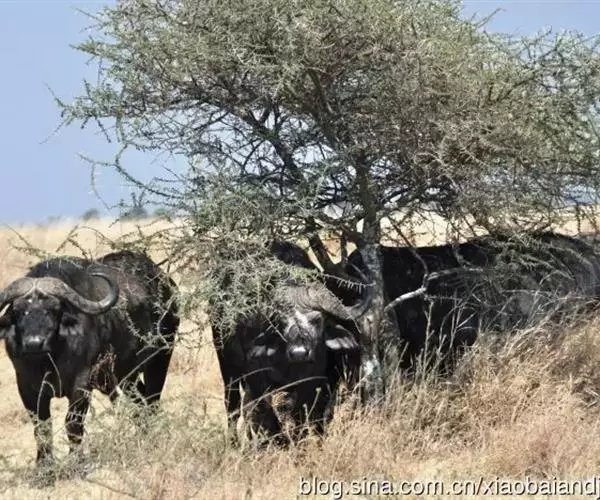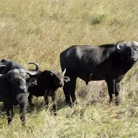非洲野水牛(学名:Syncerus caffer):共有5个亚种。头体长2.1-3.4米,身高1-1.7米,体重300-900千克。胸膛宽阔,四肢粗壮,头大角长,雄性的角从头部向外和向下扩散,在一些雄性中,角通过覆盖头部的大盾连接。头顶的柔软的毛发附着在大而下垂的耳朵上。身体通常覆盖着稀疏的毛发,通常从棕色到黑色。长尾巴,尾尖处有毛发流苏。雄性个体大于雌性,角也更大更长更厚。而热带草原的种群的体型可以达到森林栖息地的物种的两倍。