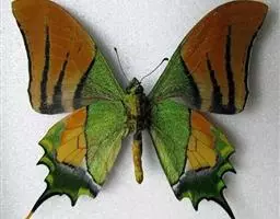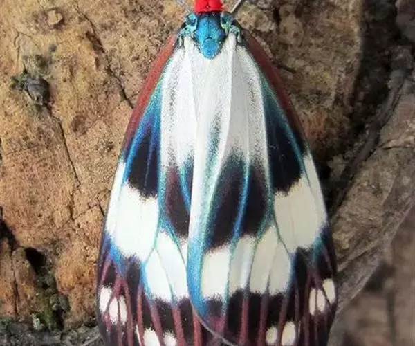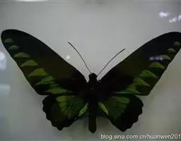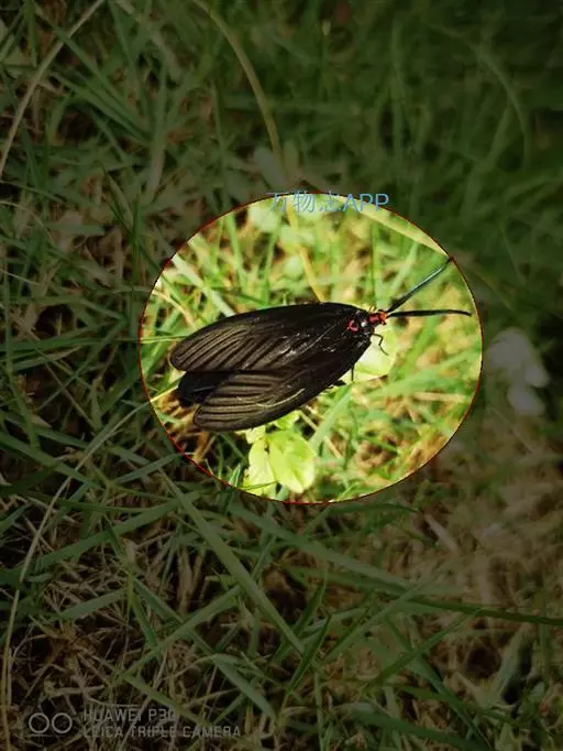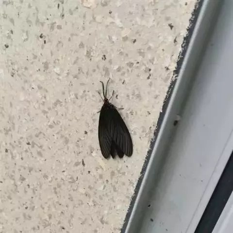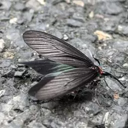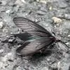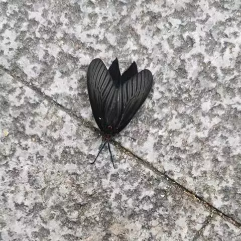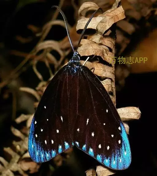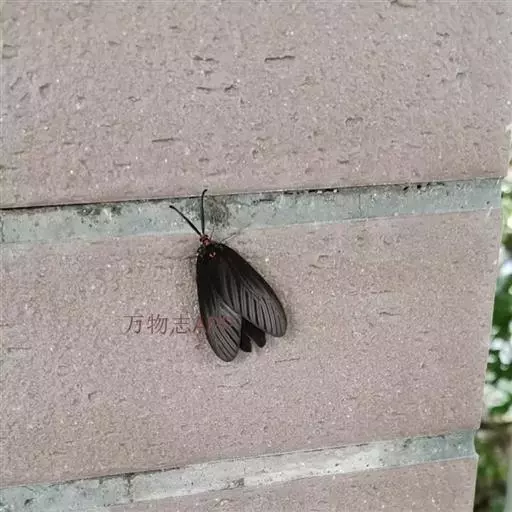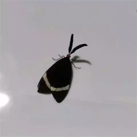 【外观特征】中小型,头小,复眼黑色,头背方形;红色,胸黑色,足黑色。触角梳齿状,柄亮蓝色,毛黑色,末端扇形。翅黑色,具金属蓝黑色光泽,双翅不为半透明,前翅背面中后方有1条宽型的斜向白色带,后翅色浅。 【生活习性】白天可见,栖息低矮的树林或草丛中,幼虫在灌木丛中取食叶片,成虫出现于4~9月。 【分布区域】安徽、台湾。