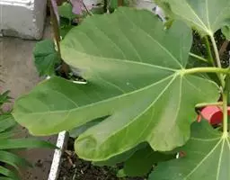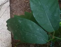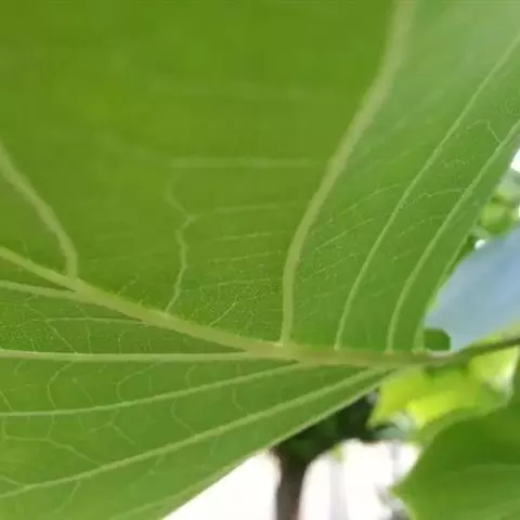 叶厚革质,广卵形至广卵状椭圆形,长10-19厘米,宽8-11厘米,先端钝,急尖,基部宽楔形,全缘,两面光滑,无毛,基生侧脉延长,侧脉5-7对;叶柄长2-5厘米,粗壮;托叶厚革质,长2-3厘米,外面被灰色绢丝状毛。