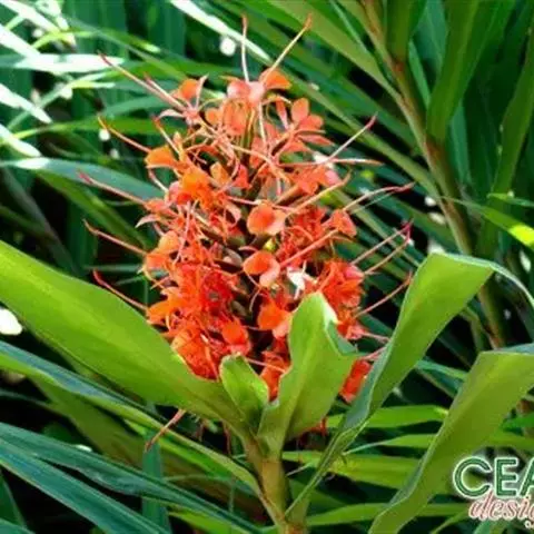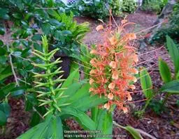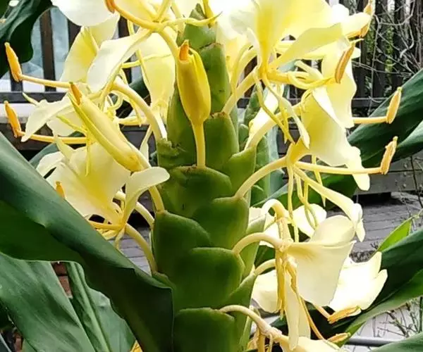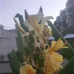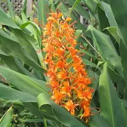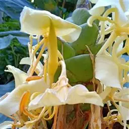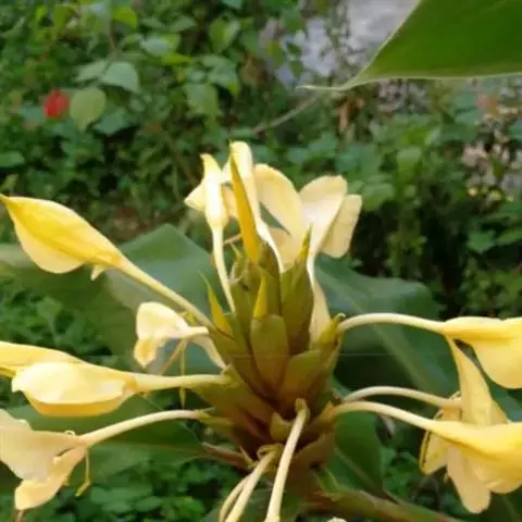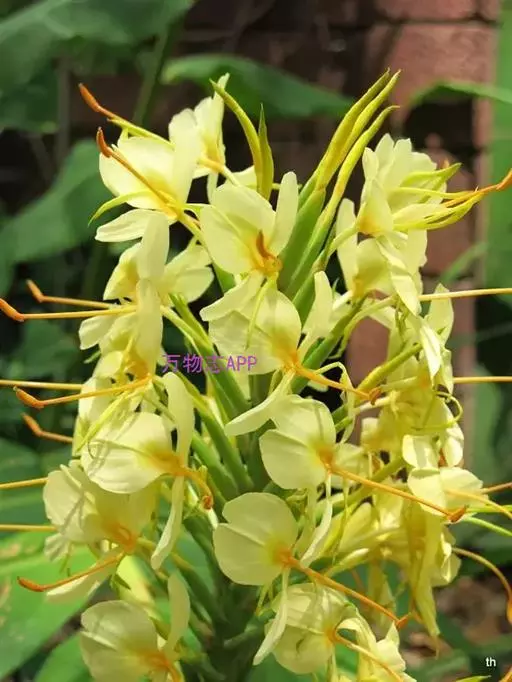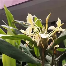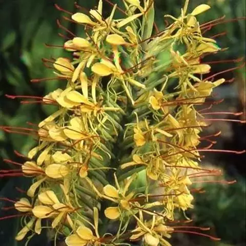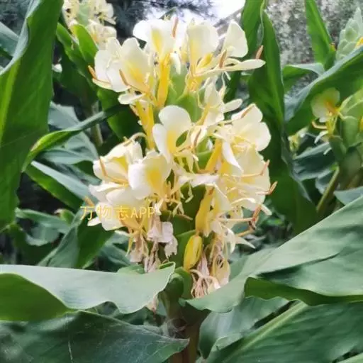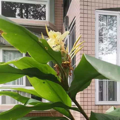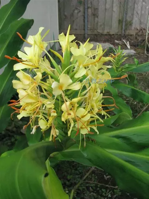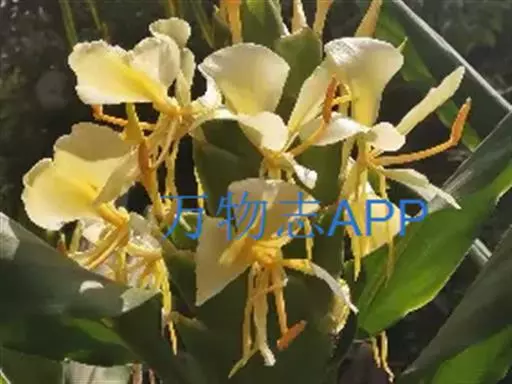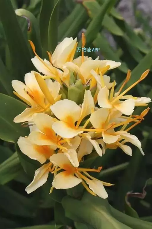 黄姜花(学名:Hedychium flavum Roxb.):姜科,姜花属多年生草本草本芳香花卉,秋冬季开花,穗状花序,长圆形;苞片长椭圆形,覆瓦状排列,每一苞片内有花3-5朵;花深黄色,形似蝴蝶,气味芬芳纯正,沁人心脾;唇瓣倒心形,黄色,当中有一个橙色的斑,顶端微凹,侧生退化雄蕊短瓣状;花朵由下至上依次开放,极为漂亮,自然栽培下,每个苞片可开花3-5朵,每支花期长约30天。