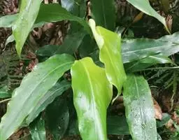 陆生或附生草本,具块状根茎。 茎高1.5-2米;叶片长圆状披针形或披针形,长25-45厘米,宽5-8.5厘米,顶端渐尖,并具尾尖,基部渐狭,两面均无毛;无柄;叶舌膜质,披针形,长2-5厘米。