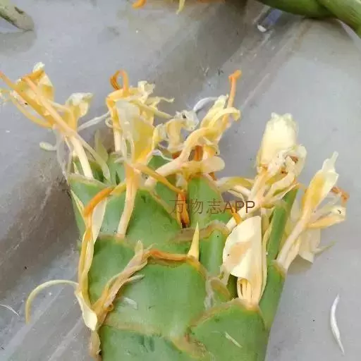 穗状花序长圆形,长约10厘米,宽约5厘米;苞片覆瓦状排列,长圆状卵形,长4-6厘米,宽1.5-3厘米,顶端边缘具髯毛,每一苞片内有花3朵;小苞片长约2厘米,内卷呈筒状;花黄色,花萼管长4厘米,外被粗长毛,顶端一侧开裂;花冠管较萼管略长,裂片线形,长约3厘米;侧生退化雄蕊倒披针形,长约3厘米,宽约8毫米;唇瓣倒心形,长约4厘米,宽约2.5厘米,黄色,当中有一个橙色的斑,顶端微凹,基部有短瓣柄;花丝长约3厘米,花药长1.2-1.5厘米,弯曲,柱头漏斗形,子房被长粗毛。花期:8-9月。