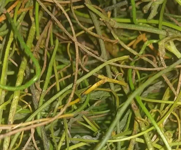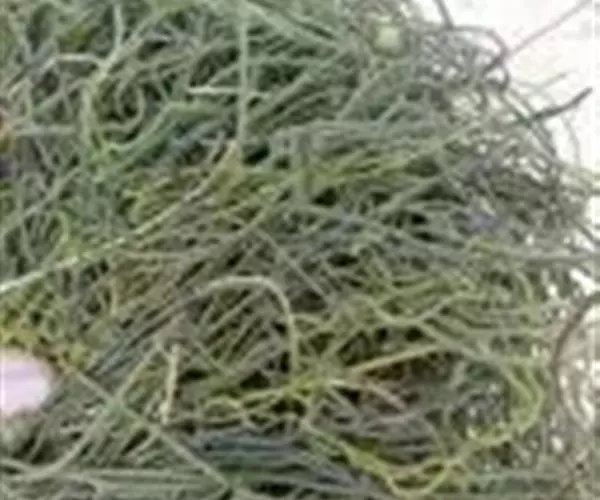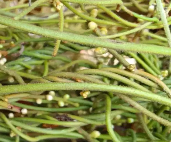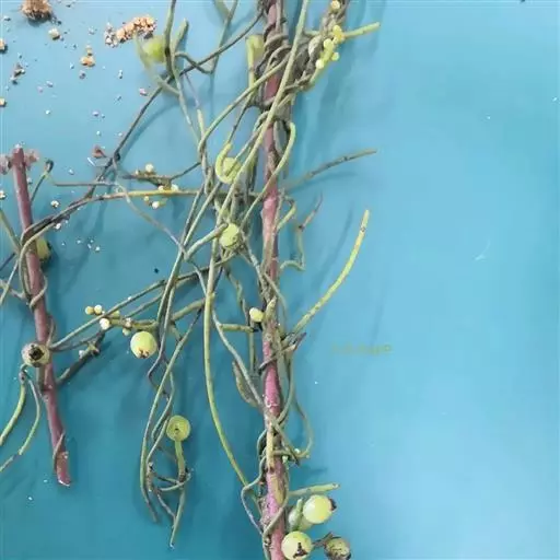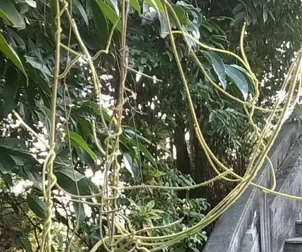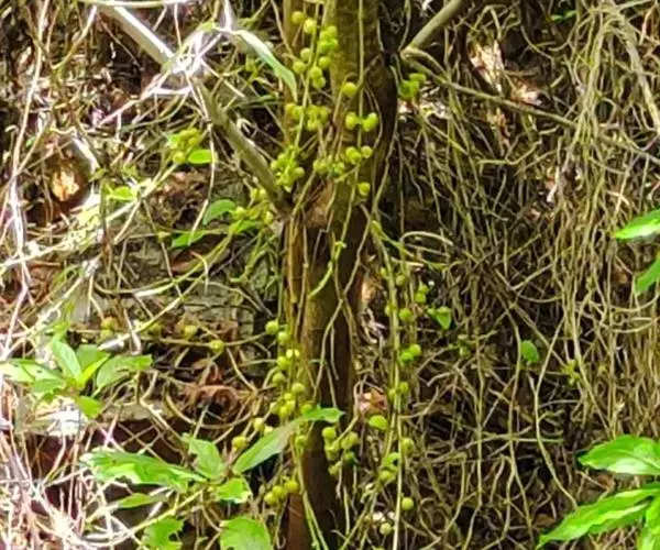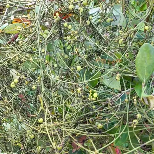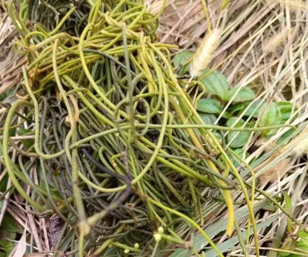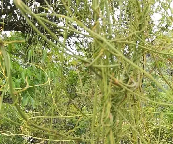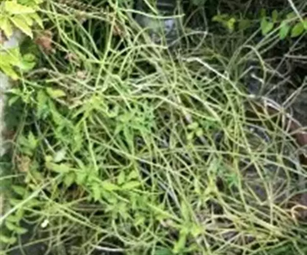 无根藤(学名:Cassytha filiformis L.)寄生缠绕草本植物,借盘状吸根攀附于寄主植物上。茎线形,稍木质,叶退化为微小的鳞片。穗状花序长2-5厘 米,花小,白色,长不及2毫米,无梗。花药2室,室外向。退化雄蕊3,位于最内轮,三角形,具柄。子房卵珠形,花柱短,略具棱,柱头小,头状。果小,卵球形。花、果期5-12月。