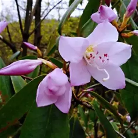 问客杜鹃:灌木,高1-3米。幼枝细长,密被腺体状鳞片。叶革质,椭圆形,卵状披针形或长圆形,上面被鳞…