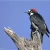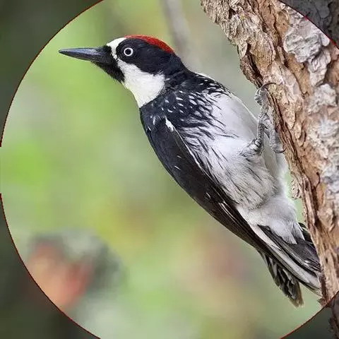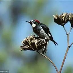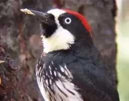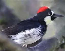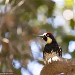 橡树啄木鸟:体长20-23厘米。前额灰黄色,头顶、后颈红色。喉下部、腰和腹部白色,…