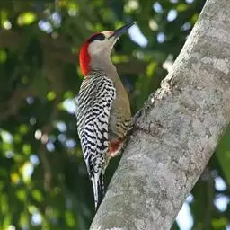 红腹啄木鸟成年雄鸟头项有红帽,翅膀和上体是黑白相间的斑纹状羽毛,腹部有一片红羽毛。头亦大,但颈较长,…