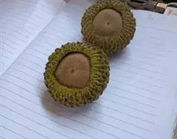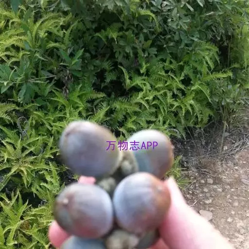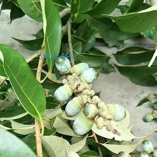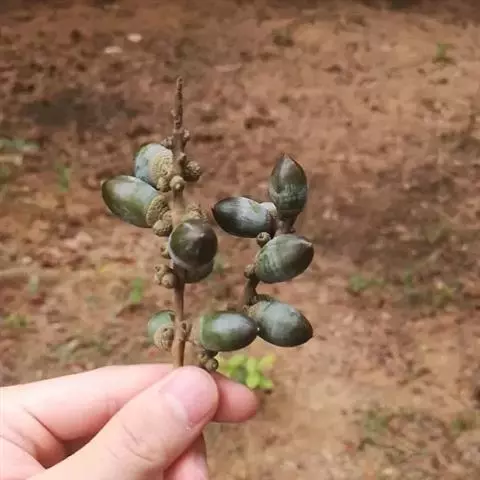 坚果椭圆形,高12-25毫米,宽8-15毫米,顶端尖,或长卵形,有淡薄的白色粉霜,暗栗褐色,果脐深达2毫米,口径3-5毫米,很少达8毫米。花期7-11月,果次年同期成熟。