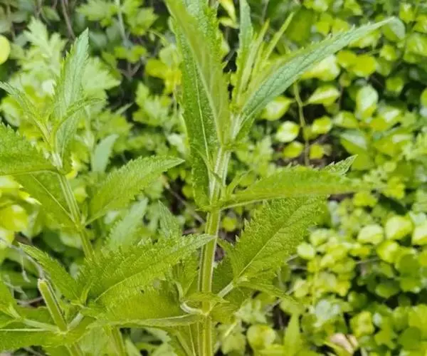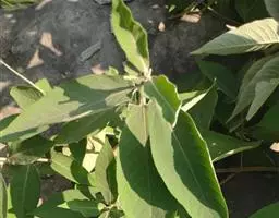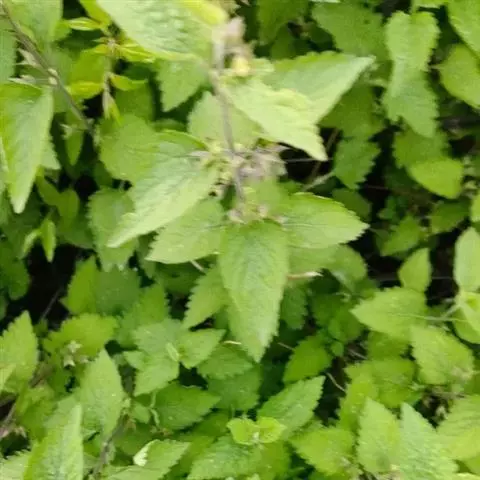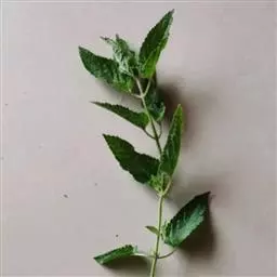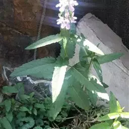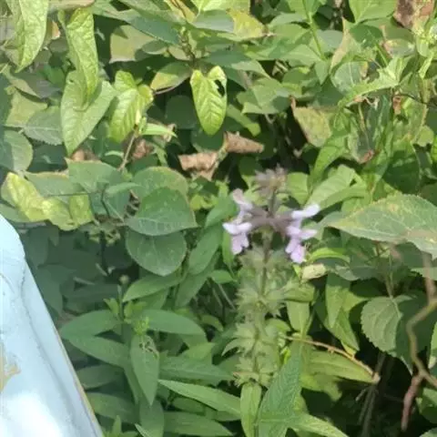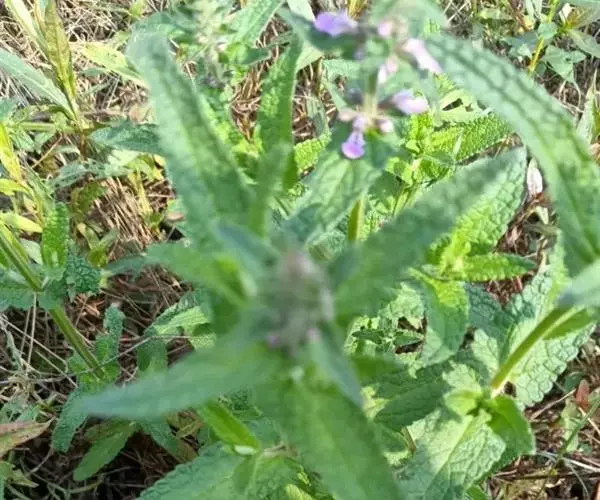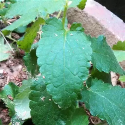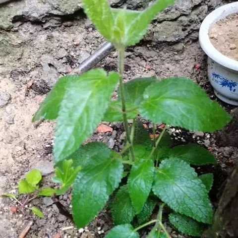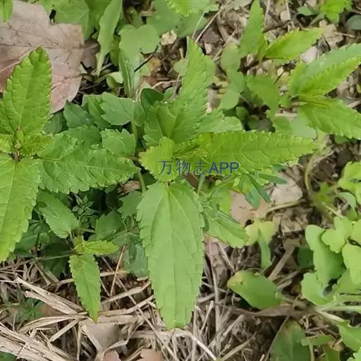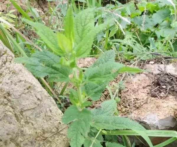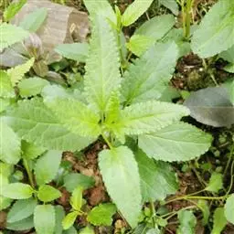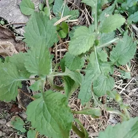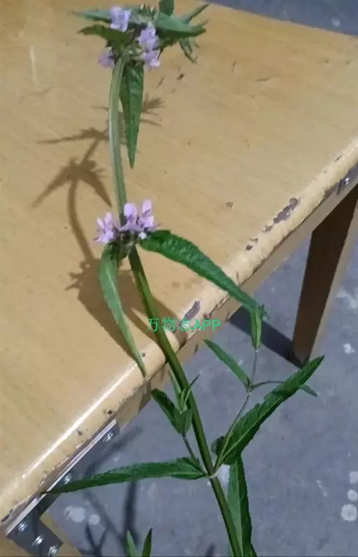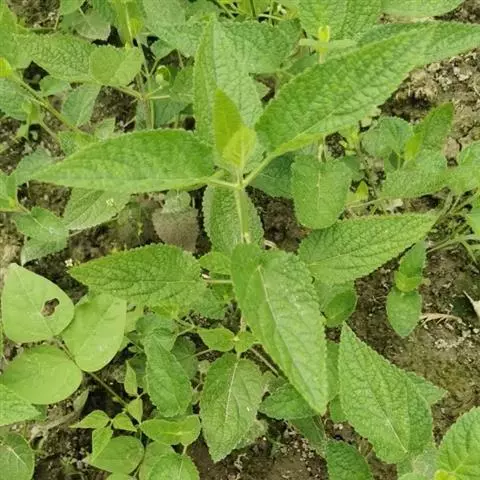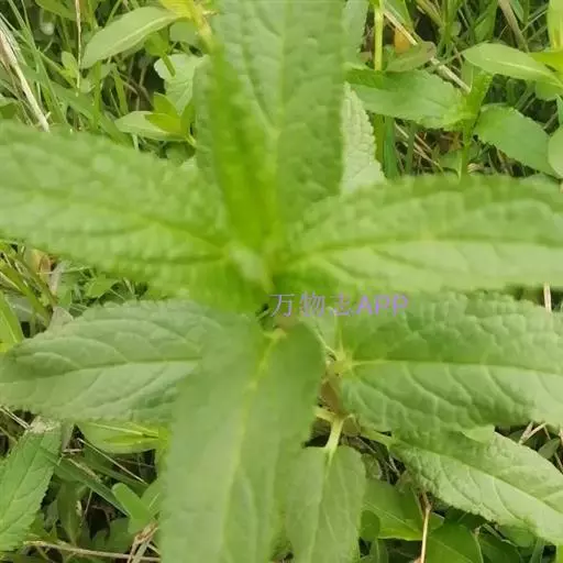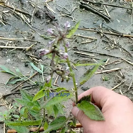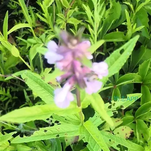 叶:茎叶长圆状宽披针形,长5-10厘米,宽1-2.3厘米,先端微急尖,基部圆形至微心形,边缘为圆齿状锯齿,上面绿色,下面灰绿色,两面均无毛,叶柄明显,长3-17毫米,近茎基部者最长,向上渐变短;苞叶披针形,无柄,近于全缘,向上渐变小,最下部者超出轮伞花序,上部者等于或短于轮伞花序。