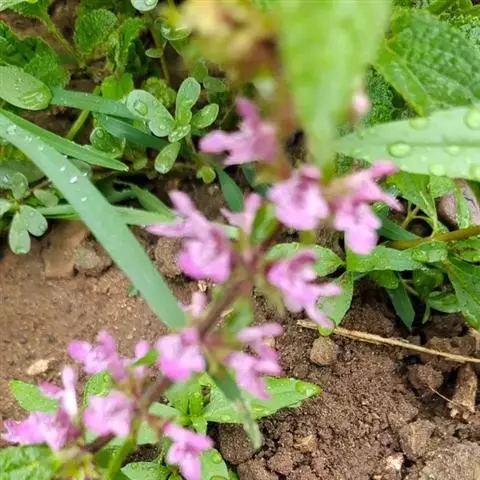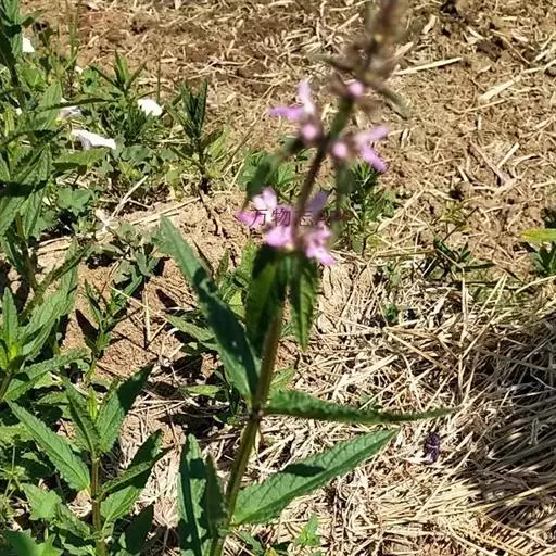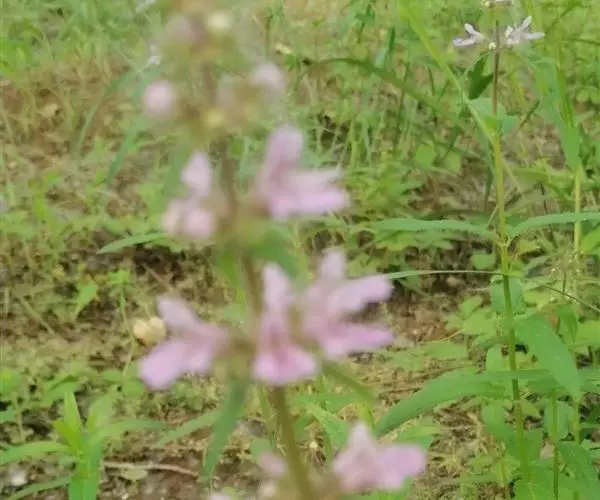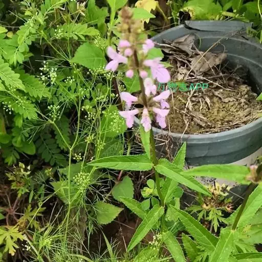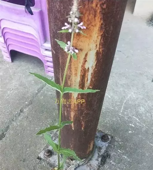 花:轮伞花序6-8花,下部者远离,上部者密集组成长5-13厘米的穗状花序;小苞片刺状,微小,长约1毫米,无毛;花梗短,长约1毫米,疏被微柔毛。花萼钟形,连齿长达7.5毫米,外被具腺微柔毛,肋上杂有疏柔毛,稀毛贴生或近于无毛,内面在齿上疏被微柔毛,余部无毛,10脉,不明显,齿5,等大,三角状披针形,先端具刺尖头,边缘具缘毛。花冠粉红或淡红紫色,长约1.2厘米,冠筒长约6毫米,几不超出于萼,外面无毛,内面在近基部1/3处有微柔毛毛环及在下唇下方喉部有鳞片状微柔毛,前面紧接在毛环上方呈囊状膨大,冠檐二唇形,上唇直立,倒卵圆形,长4毫米,宽2.5毫米,外面被微柔毛,内面无毛,下唇开张,长7毫米,宽6毫米,外面疏被微柔毛,内面无毛,3裂,中裂片最大,近圆形,先端微缺,侧裂片卵圆形。雄蕊4,均延伸至上唇片之下,花丝丝状,先端略增大,被微柔毛,花药卵圆形,2室,室极叉开。花柱丝状,稍超出雄蕊,先端相等2浅裂。花盘平顶。子房黑褐色,无毛。