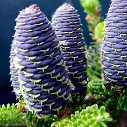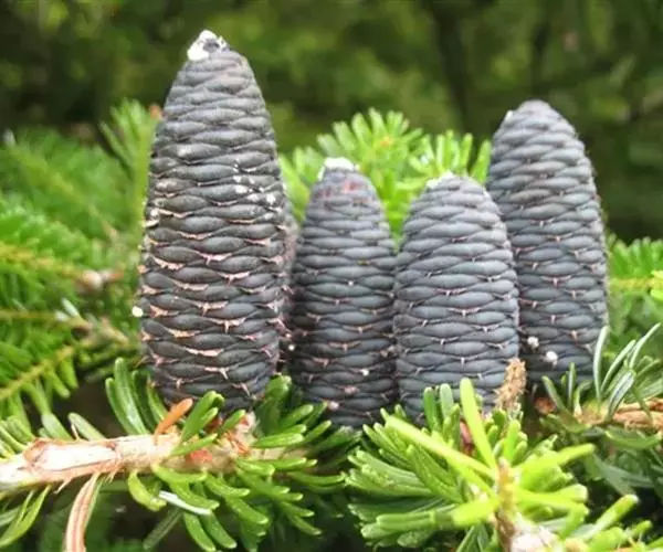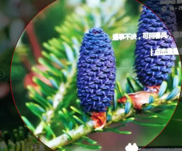 球果柱状矩圆形或圆柱形,长5-8厘米,径3-4厘米,成熟时淡紫色、紫黑色或红褐色;中部种鳞肾形或扇状肾形,长0.8-1.2厘米,宽1.5-2厘米,上部宽厚,边缘内曲;苞鳞倒卵状楔形,上部圆,边缘有细缺齿,先端有急尖的短尖头,尖头露出或微露出;种子倒三角状卵圆形,种翅楔形,较种子为短或等长。