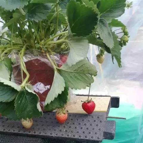 二、移栽技术 为争取元月底至2月初草莓上市,繁育圃草莓苗移栽大棚畦面的时间应在9月上旬。要随起苗,随移栽,每畦栽2行,行距27厘米,穴距20厘米,亩栽12000株。栽植时同一行植株的花序朝同一方向,使草莓苗弓背朝花序预定生长方向,苗心露出畦面,根系平展埋入疏松土层,及时浇定植水,并使外露的根埋入土层中。 三、草莓园的管理 1、中耕与施肥。中耕松土,利于有机物分解。11月至12月应浅中耕3次。初花期与坐果初期各追肥1次。亩施尿素10千克,磷肥20千克,氯化钾10千克,或三元复合肥35千克。 2、花芽分化前期的管理。9月上旬移栽的草莓苗,除及时补充水分外,应加盖遮阳网遮荫。网离地面1.2 米,便于人员操作。要及时摘除枯叶、老叶及腋芽和匍匐茎,保持5~6片叶。草莓花芽分化需较低温度和短日照,可在遮阳网上加盖草苫(草帘)。通过揭与盖草苫的操作过程,人工造成短日照的条件及较低温度,促进顶花序和腋花序的分化,时间有月余。 3、灌排方法。在开花与浆果生长初期,分别灌水1次。宜用沟灌,使水灌到沟高2/3处为好,让水渐渐渗入畦土,沟内余水排出。若天旱,应5~7天灌水1次。用橡胶管前端套上一段金属管进行穴灌,既省水,又能保持畦土疏松。秋季多雨时,应及时排水。草莓园四周应早做排水沟道,使棚内畦沟水能排尽。 4、加盖塑膜。10月至11月上旬,是草莓花序分化期末,可撤除遮阳网。江准地区,“立冬”后盖地膜,“大雪”前覆盖大棚膜,使棚内气温保持在28~30℃。“暖冬”年份,“冬至”时节加盖中棚塑膜。“冷冬”年份则应同时盖上大、中棚塑膜。总之,“小寒”至“大寒”时节,棚内气温应保持在25℃以上,至少也在23℃以上,只有满足以上气温,草莓才能正常生长。 5、通风操作。草莓苗生长的土壤湿度应在70%~80%为宜。棚内空气湿度以60%~70%为好。因此,当棚内气温超过30℃时,应通风。11月至12月应于上午10时至下午3时揭开大棚及中棚两头塑膜通风。当棚内湿度超过70%时,也应通风,以降低棚内空气湿度。花期棚内放养蜜蜂,可在大、中棚两头另做尼龙丝网,便于顺利通风。大棚通风的另一作用,是防治草莓白粉病。 6、采收。草莓苗开花、坐果到浆果着色,软化,释放特有香味,时间约 30天。草莓浆果成熟后,应分批采收上市。一般亩产草莓1500千克。 四、草莓园病害防治 1、黄萎病。发病时,1~2片叶变黄,弯曲畸形,逐渐枯死。防治方法:可在春季于园内多施切碎稻草、木屑,加农家粪肥,翻耕,并耕入土壤中,作畦,充分灌水后,覆盖地膜,通过太阳能使之彻底发酵。既增加了有机质,又彻底消毒。此法,也可防治根腐凋萎病。 2、灰霉病 为草莓花期病害,花瓣、果实、叶上均可发生。果实发病则密生灰霉,严重减产。防治方法:发病初,可亩喷洒10% 多氯霉素100克,对水100~110千克,每7天喷1次,连喷3~4次。