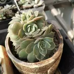 大和锦是景天科拟石莲花属的多肉植物。肉质叶排成紧密的莲座状,广卵形至散三角卵形,背面突起呈龙骨状,…
