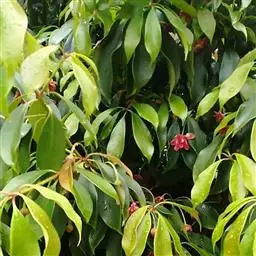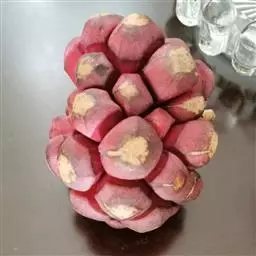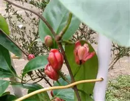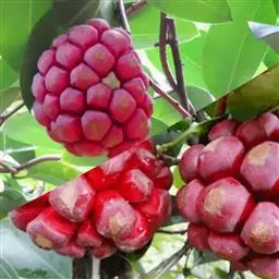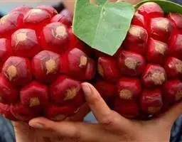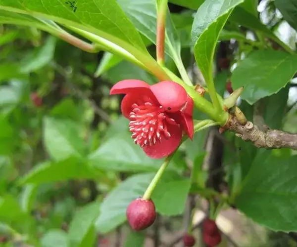 花红色,雄花:花梗长2~5cm,花被片5~8,外花被片有缘毛,大小近相似,椭圆形或倒卵形,最大的长10~17mm,宽6~16mm,最外及最内的较小;雄蕊群椭圆状倒卵圆形或近球形,直径约1厘米;雄蕊40~60枚,花药长1.5~2mm,外向开裂,药隔与药室近等长,有腺点,下部雄蕊的花丝长2~4mm;雌花:花梗及花被片与雄花的相似,雌蕊群长圆状椭圆体形,长8~10mm,心皮60~100枚,倒卵圆形,长1.5~2.3mm,柱头长3~8mm,具明显鸡冠状凸起,基部下延成长3~8mm长的附属体。聚合果轴粗壮,直径6~10mm,长9~18cm。