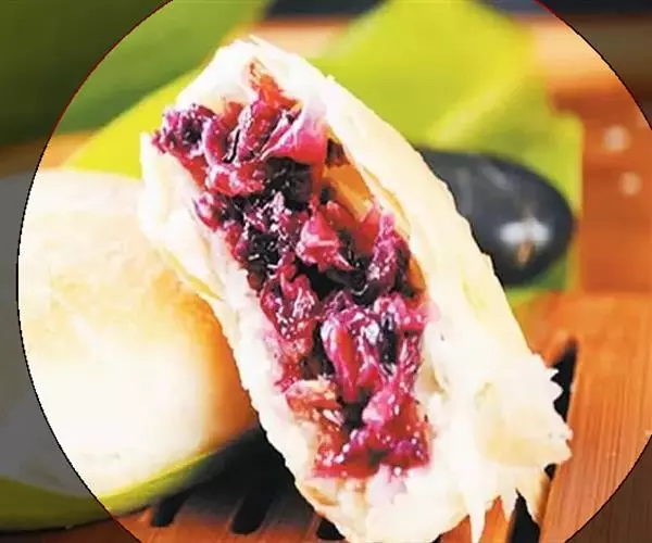 14、将面取出擀成薄片,压型后加入叉烧馅。