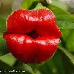 嘴唇花顾名思义,就是花的外形像极了人类性感诱人的嘴唇。形似嘴唇的红色部分并非真正意义上的花瓣,而是花朵的苞片。这种植物颜色鲜红,造型奇特。看似经过技术处理过的,然而,可以很确定它那诱人的嘴唇是天生的。该植物进化为这种形状是为了吸引蜂鸟和蝴蝶等传粉昆虫,花期12月至次年3月。