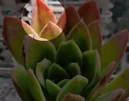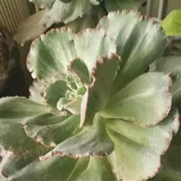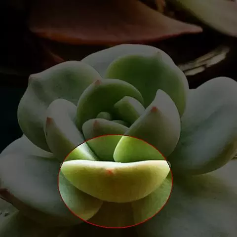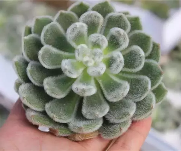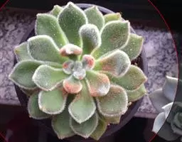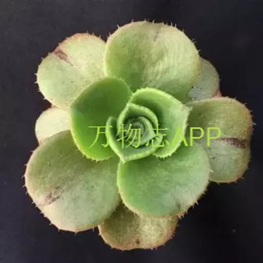 莲座叶盘无茎,老株易丛生。大的莲座叶盘由100片以上的叶组成。叶长5—7厘米、宽2厘米,基部狭窄,先端卵形并较厚,叶正面微凹、背面圆突,叶先端有微小的钝尖。叶绿色,叶端微呈红褐色,全叶被0.3厘米长的白毛。花序高20—30厘米,小花多,黄红色。本种形态有点像一种普遍栽培的同科属种类锦晃星,不同的是它没有高的茎,叶片比锦晃星厚,叶缘也没有锦晃星红。