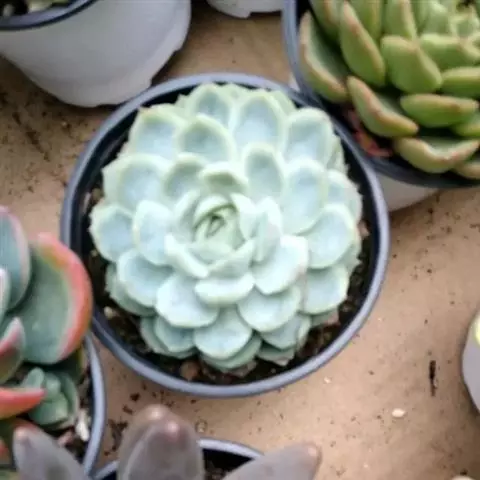 大和锦是景天科拟石莲花属的多肉植物。肉质叶排成紧密的莲座状,广卵形至散三角卵形,背面突起呈龙骨状,…