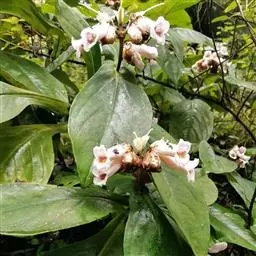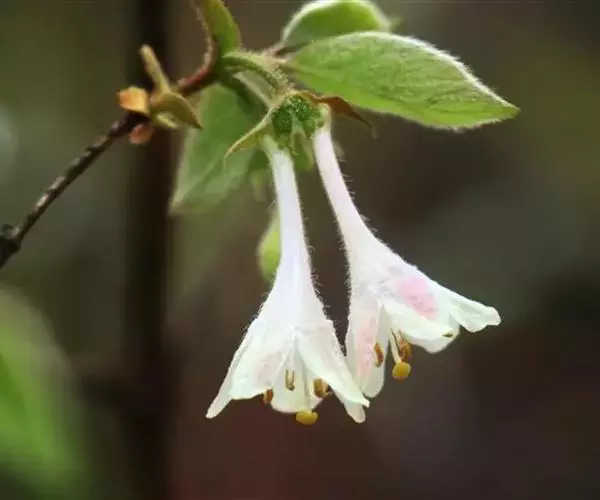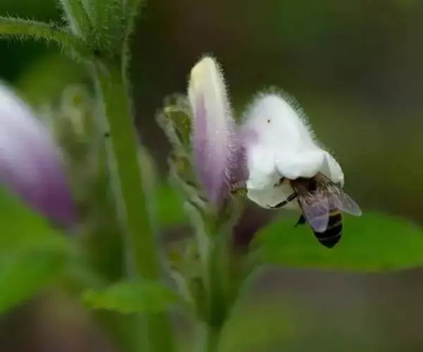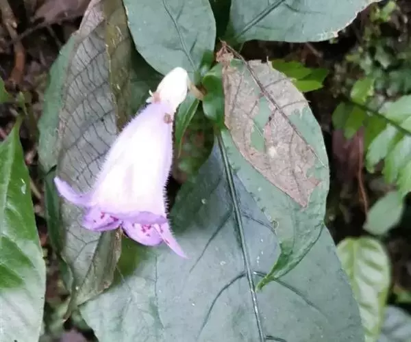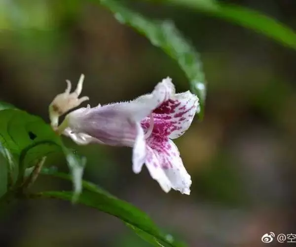 聚伞花序假顶生或腋生,具1-3花;花序梗长0.2-1.2厘米,无毛,总苞球形,直径1-1.4(-2)厘米,顶端具细长尖头,无毛,开放后呈船形;花梗长2-5毫米,无毛;萼片5,线状披针形至长椭圆状披针形,长5-8毫米,宽2-4毫米,无毛。花冠粉红色,具紫色斑点,长3-3.8厘米;筒长2.2-2.8厘米,外面疏生腺状短柔毛,内面基部上方4-5毫米处有一毛环,口部直径15-17毫米,基部上方直径8毫米;上唇长5-8毫米,2浅裂,裂片半圆形,下唇长8-10毫米,3浅裂,裂片半圆形。雄蕊:花丝着生于花冠基部8-11毫米处,狭线形,长11-12毫米,花药长圆形,长(1.1-)1.7-2.5毫米,顶端连着;退化雄蕊2,长4-5毫米,顶端小头状,分离。花盘环状,高1毫米。雌蕊长2-2.5厘米,无毛,子房线形,柱头头状。蒴果线状披针形,长1.7-2.5厘米,宽2.2-3毫米,无毛。花期8-10月,果期10-11月。