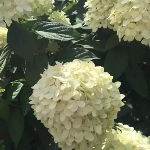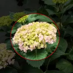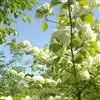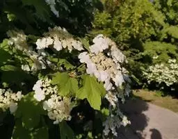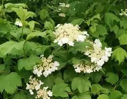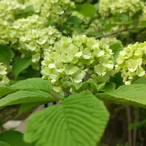 聚伞花序直径5~9厘米,花开后几无毛,周围有大型、白色的不孕花,无总花梗,第一级辐射枝常5条,花生于第三级辐射枝上,芳香;萼筒近圆球形,长约2毫米,萼齿卵圆形;花冠白色或带微红,辐状,直径5~6毫米,裂片卵形,长二倍于筒;雄蕊花药宽卵圆形,黄色;花柱不高出萼齿;不孕花直径2.5~3厘米,裂片倒卵形,常大小不等。