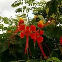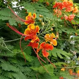 洋金凤 Sw.),豆科小凤花属灌木状或小乔木植物,枝无毛,绿或粉绿色;二回羽状复叶;总状花序伞房状,…