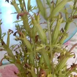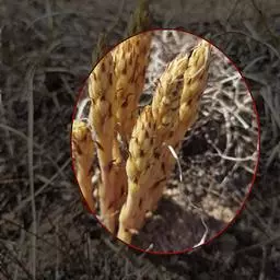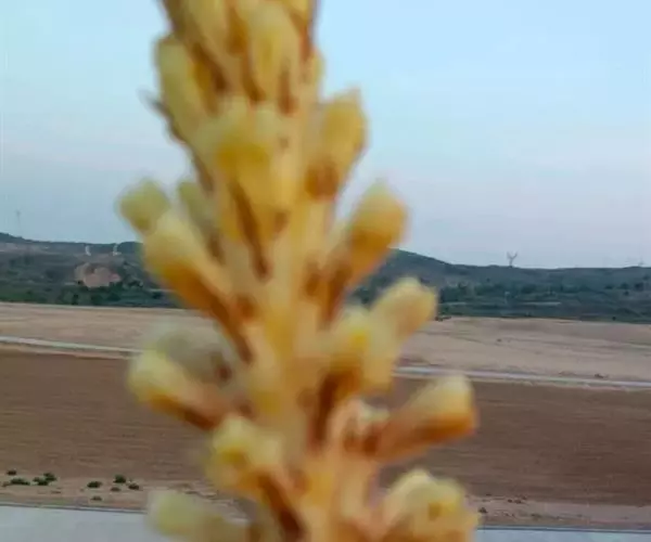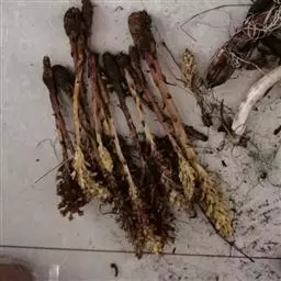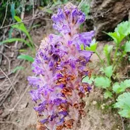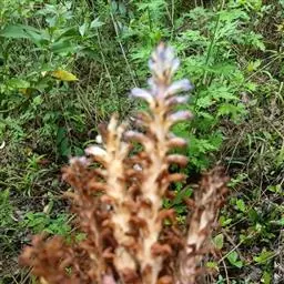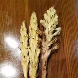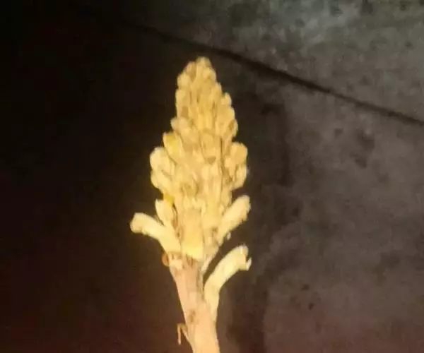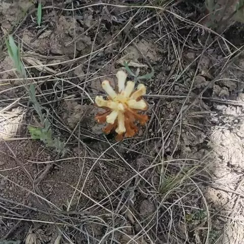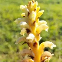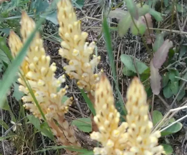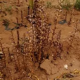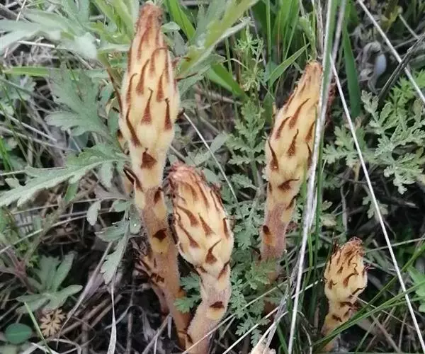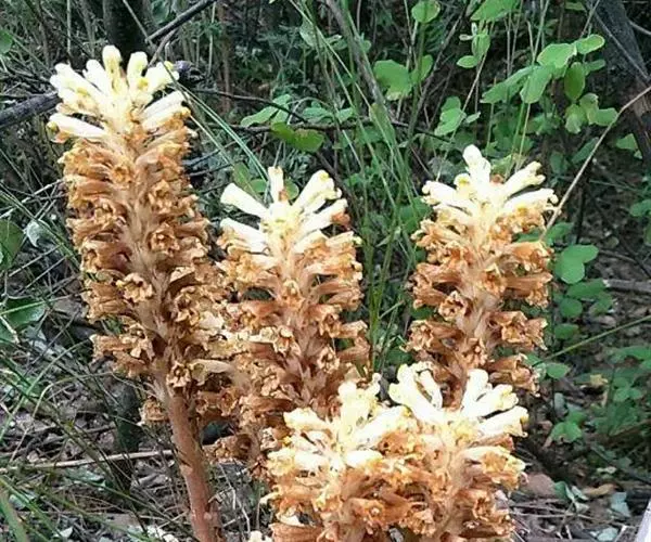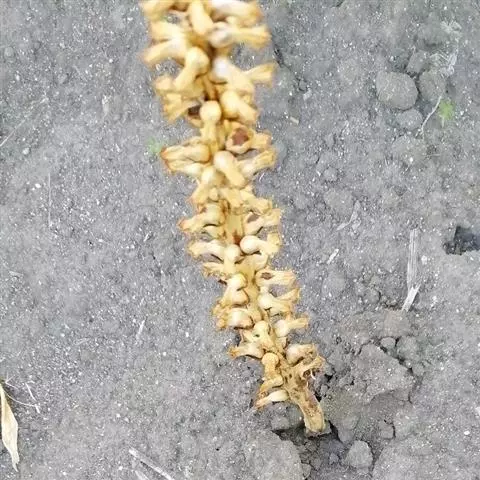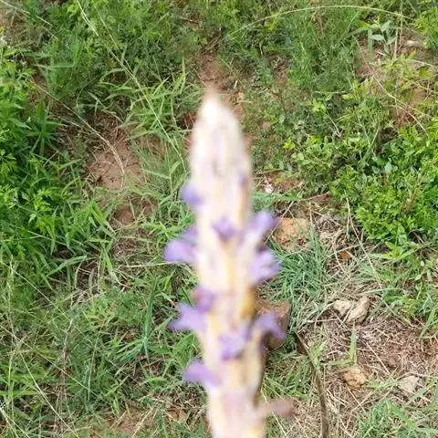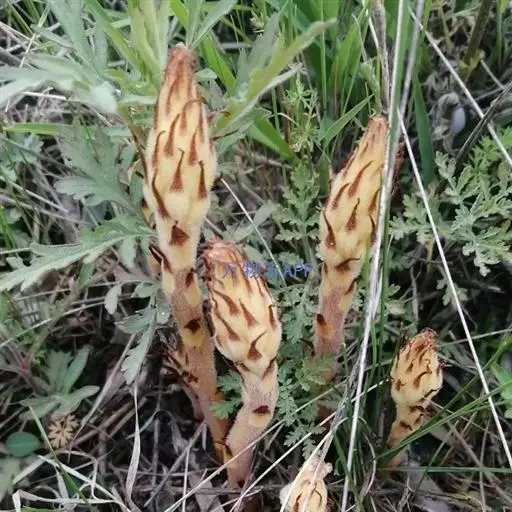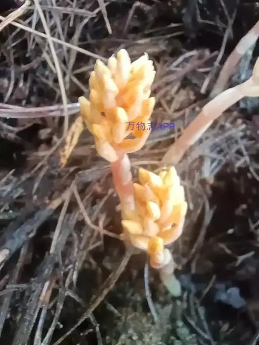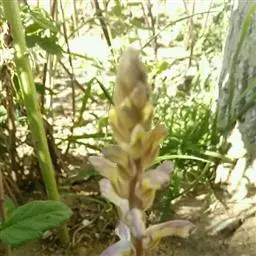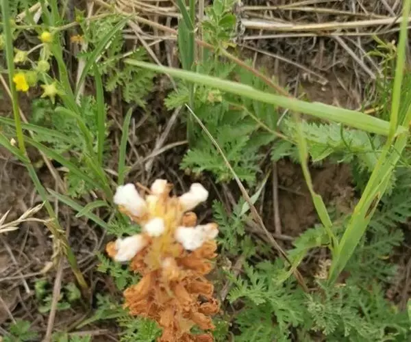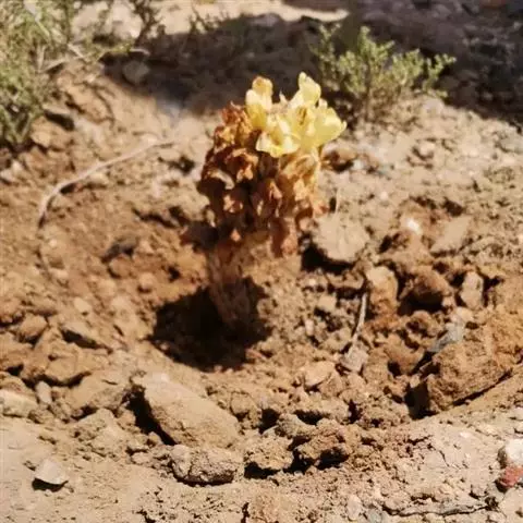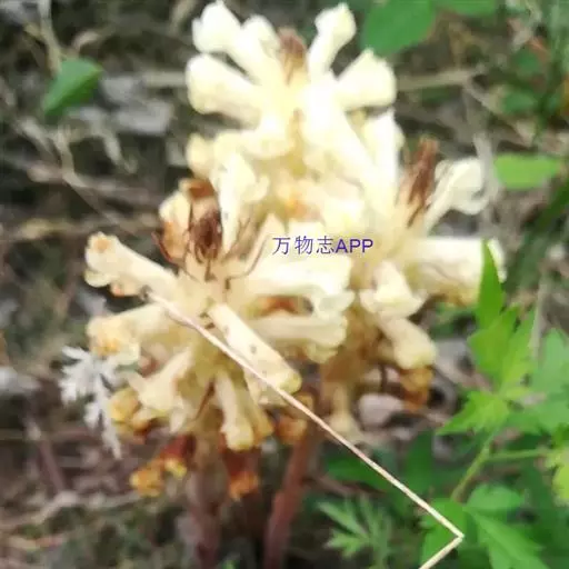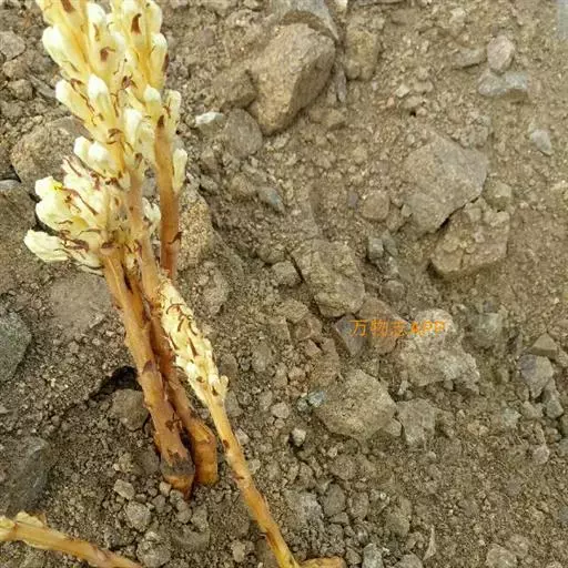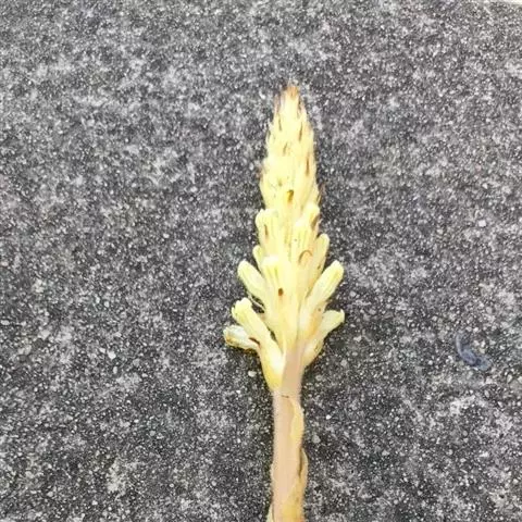 【特征】: 一年生寄生草本。株高10-34厘米,植株密被腺毛。茎直立,常不分枝,圆柱形,基部常膨大,黄褐色。叶为鳞片状、卵状披针形。