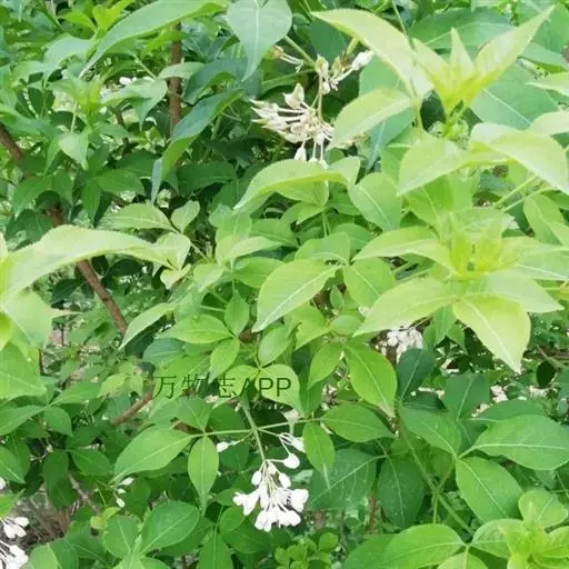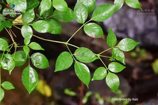 落叶灌木,高约2米,稀达5米,树皮紫红色或灰褐色,有纵棱;枝条开展,绿白色复叶对生,有长柄,柄长2.5-3厘米,具三小叶;小叶椭圆形、卵圆形或卵状披针形,长(3.5-)4.5-8厘米,宽(2-)2.5-5厘米,先端锐尖,具尖尾,尖尾长约1厘米,基部楔形或圆形,边缘有细锯齿,齿尖具尖头,上面无毛,背面青白色,主脉及侧脉有短毛;中间小叶柄长5-10毫米,两侧小叶柄长1-2毫米。