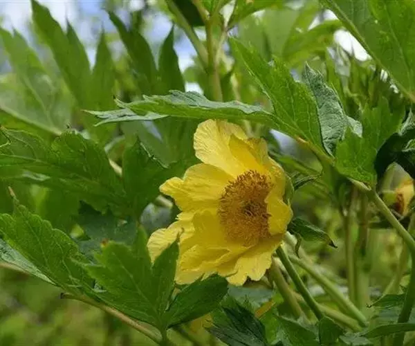 落叶灌木。高1-2.5m,最高可达3.5m。叶 大花黄牡丹 为2回3出复叶,带有美丽的青铜色。花(2)3-4朵生枝顶或叶腋,直径8-12cm;花瓣、花丝与花药均为黄色; 心皮1,少数2。花期5月,果期8-9月。它以植株高大、花朵硕大而显著、心皮数较少区别于滇牡丹P.delavayi,是极珍贵的牡丹观赏、育种材料。