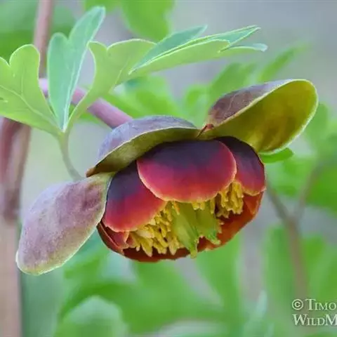 落叶灌木,基部多分枝而成丛,高达3.5米,根向下逐渐变细,不呈纺锤状加粗。茎灰色,径达4厘米。叶二回三出复叶,两面无毛,上面绿色,下面淡灰色,叶柄长9-15厘米,小叶9枚,叶片长12-30厘米,宽14-30厘米,每边的侧生3个小叶的主小叶柄长2-3厘米,顶生3小叶的主小叶柄长5-9厘米;小叶近无柄,长6-12厘米,宽5-13厘米,通常3裂至近基部,全裂片长4-9厘米,宽1.5-4厘米,渐尖,大多3裂至中部,裂片长2-5厘米,宽0.5-1.5厘米,渐尖,全缘或有1-2齿。花序腋生,有3-4花;花径10-12。