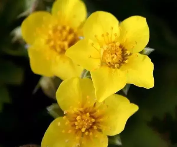伞房状聚伞花序,花梗长0.5-16厘米,基部有披针形苞片,外面密被短柔毛;花直径通常0.8-1厘米,稀达1.3厘米;萼片三角卵形,顶端急尖,副萼片带形或披针形,顶端尖,比萼片短约1倍且狭窄,外面被短柔毛及少数绢状柔毛;花瓣黄色,宽倒卵形,顶端微凹,比萼片稍长;花柱近顶生,基部微扩大,稍有乳头或不明显,柱头扩大。