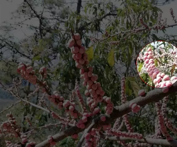 榕果单生或成对或簇生于叶腋或生无叶枝上,扁球形,直径5-8毫米,成熟时紫黑色,顶部微下陷,基生苞片3,宽卵圆形,革质;总梗长3-4毫米;雄花、瘿花、雌花生于同一榕果内;雄花很少,生内壁近口部,无梗,花被片3,宽卵形,雄蕊1枚,花药卵圆形,花丝短;雌花无柄或有柄,花被片3,披针形,花柱短,侧生,柱头圆形;瘿花多数,与雌花相似,仅子房有粗长的柄,柱头线形。花期4-6月。