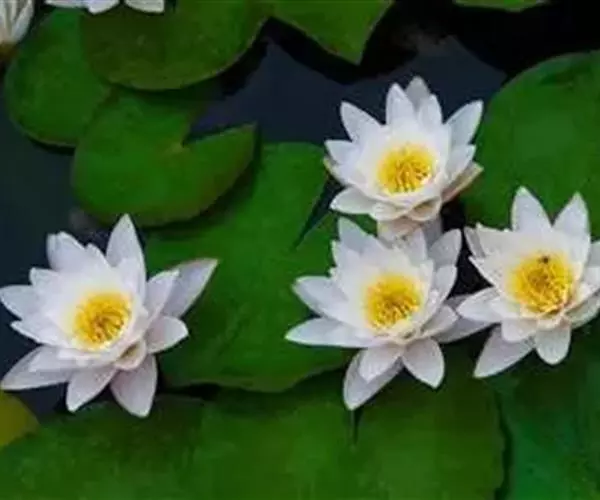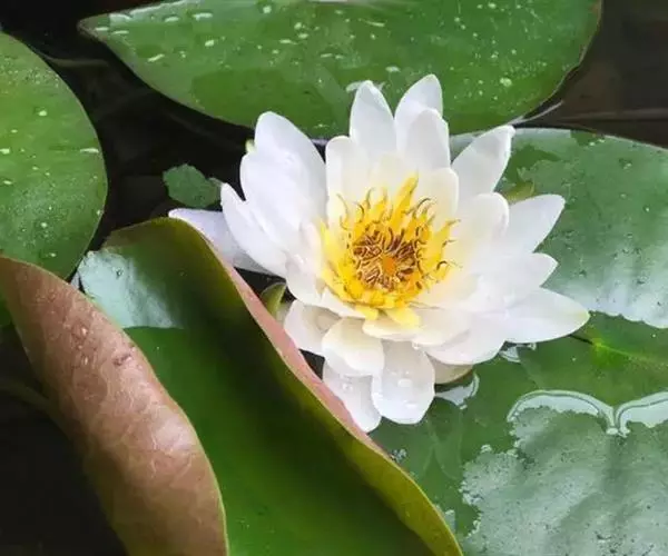 花瓣白色,花径2.5厘米,花萼淡绿白色,花药金黄色,雄蕊金黄色。花瓣及花萼数各为8-12及4。幼叶紫绿色,背面颜色稍浅于成叶;成叶铜绿色,叶缘红色,背面铜红色,脉纹明显。叶椭圆形,叶基“V”字形开裂,裂片契形,先端圆钝。叶长5×9厘米,叶展40-60厘米。评述:这是一个最小型的白花耐寒睡莲品种。能结实,果实为浆果,近球形,黑褐色种子发芽率较高。适合盆、桶栽及小型水池栽植。