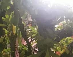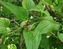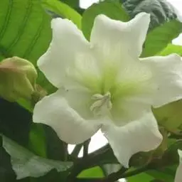 花白色,杯状,直径6厘米。花蕾绿色桃形。萼片4枚,背面绿色,正面白色。花瓣数22,雌雄蕊金黄色。花柄绿色,着生有茸毛。叶子马蹄形,正面绿色,背面棕红色,叶径19×19厘米。叶柄绿色,着生有茸毛。