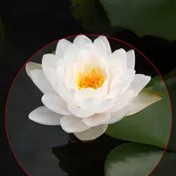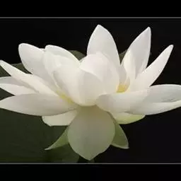 花白色(263.White),牡丹型,花朵挺水,直径10c厘米花蕾绿色,有褐色斑点,长桃形。萼片数4,背面绿色,正面白色。花瓣数27,雌雄蕊均为黄色。叶子正圆形,叶裂重叠,叶表及背面皆为绿色,叶径16×16c厘米。花柄红褐色,着生有茸毛。
