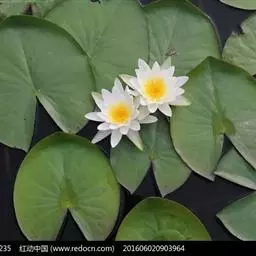 红花睡莲,多年生浮水植物。叶浮于水面,卵形,革质,表面绿色,背面紫红色,幼叶红色,花昼开夜合,浮于…