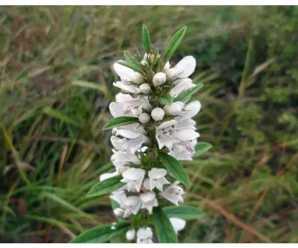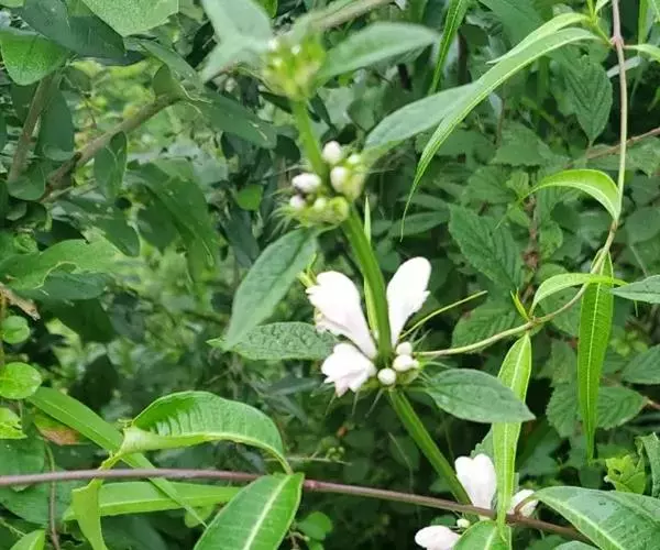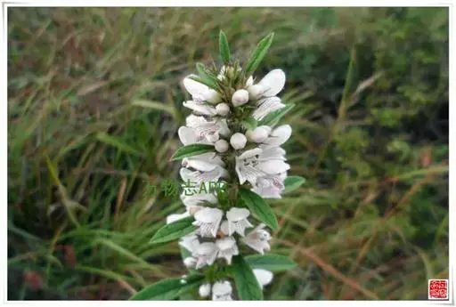 轮伞花序腋生,多花,远离而向顶密集组成长穗状;小苞片少数,刺状,直伸,长5-6毫米,基部相连接,具糙硬毛,绿色;花梗无。 花萼管状,长7-8毫米,外面被微硬毛,沿脉上被长硬毛,其间混有淡黄色腺点,中部以上均绿色,中部以下渐近基部毛被疏少而呈草黄色,内面无毛,脉5,除近基部外明显突出,齿5,前2齿靠合,较大,长5毫米,直伸,钻状,先端刺尖,后3齿较小,均等大,长3毫米,直伸,三角状钻形,先端刺尖。 花冠白色,常带紫纹,长1.8厘米,冠筒长约8毫米,外面在中部以下无毛,中部以上被疏柔毛,内面在上部被短柔毛,中部具近水平向的鳞状毛毛环,其下方无毛,冠檐二唇形,上唇长圆状卵形,先端近圆形,基部略收缩,长达1厘米,直伸,稍内凹,全缘,白色,外被疏柔毛,内面无毛,下唇轮廓为卵形,长约8毫米,宽约5毫米,白色,具紫纹,3裂,外被疏柔毛,内面无毛,中裂片较大,倒心形,先端微凹,明显2小裂,侧裂片卵圆形。 雄蕊4,均延伸至上唇片之下,前对较长,花丝丝状,扁平,具紫斑,中部以下或近基部有微柔毛,花药卵圆形,2室。花柱丝状,先端相等2浅裂。花盘平顶。子房褐色,无毛。