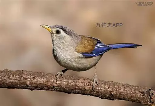 黄喉噪鹛体型略小,顶冠蓝灰色,特征为具黑色的眼罩和鲜黄色的喉。上体褐色,尾端黑色而具白色边缘,…