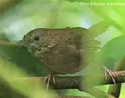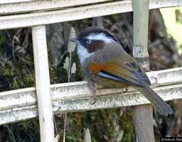 玉山噪鹛中等体型的褐色鸟类。白色长眉纹及髭纹显著;顶冠灰而具白色的鳞状斑纹;脸侧及颏褐色,…