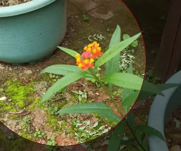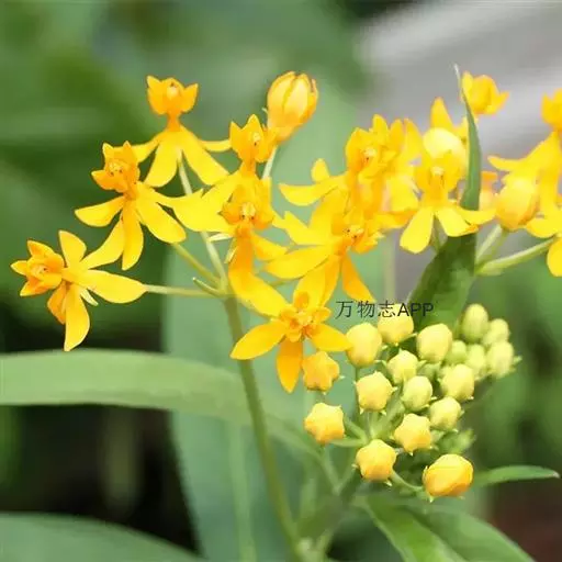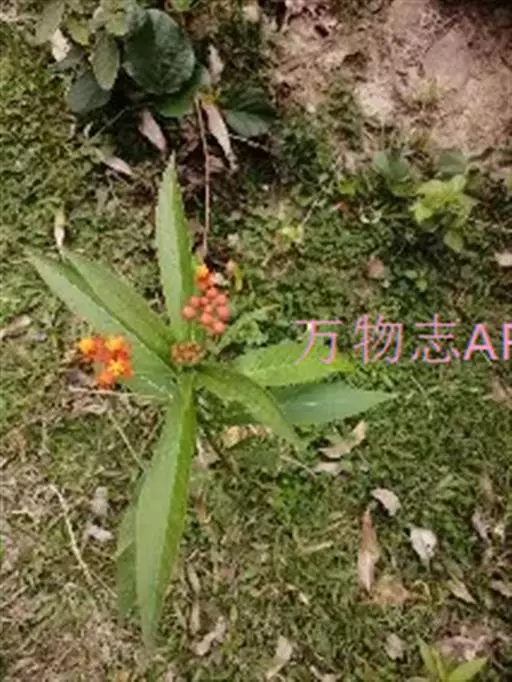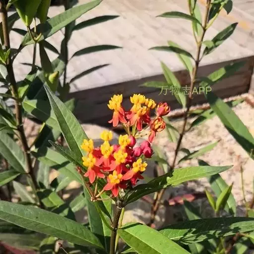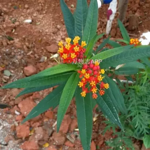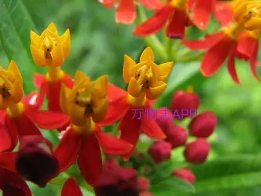马利筋(Asclepias curassavica L.),又名莲生桂子花、芳草花、水羊角,萝藦科(Asclepiadaceae)宿根多年生草本,灌木状,高达60-120cm。全株含白色体液。叶对生,披针形,全绿。伞形花序着花10余朵;花朵小巧玲珑,花冠朱红色,5深裂;副花冠金黄色,带有角状突起,矗立呈兜状,盛开时轻盈明媚,多姿多彩。花期春至夏季。花后能结果,蓇葖果鹤嘴形,成熟后会裂开,内有多粒棕黑色种子,种子顶端具白色绢质种毛,好像降落伞,随风飘飞,到处播种。