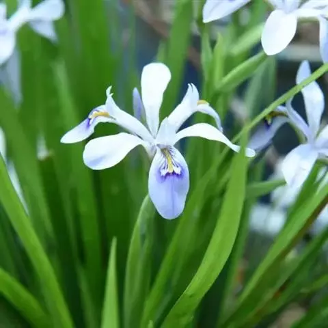 双色野鸢尾为多年生草本植物,叶子呈剑状淡绿色。…