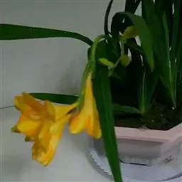 多年生草本;高50-100厘米。球茎扁圆球形,外包有棕褐色网状的膜质包被。叶多基生,剑形,长40-60厘米,基部鞘状,顶端渐尖,中脉明显;茎生叶较短而狭,披针形。花茎常2-4分枝,由多花组成疏散的穗状花序;每朵花基部有2枚膜质的苞片;花两侧对称,橙黄色,直径3.5-4厘米;花被管略弯曲,花被裂片6,2轮排列,披针形或倒卵形,长约2厘米,宽约5毫米,内轮较外轮的花被裂片略宽而长,外轮花被裂片顶端略尖;雄蕊3,长1.5-1.8厘米,偏向花的一侧,花丝着生在花被管上,花药“丁”字形着生;花柱长2.8-3厘米,顶端3裂,柱头略膨大。蒴果三棱状球形。花期7-8月,果期8-10 月。