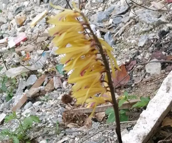 花葶从假鳞茎上部节上发出,近直立,长27-70厘米;总状花序长(5-)10-25厘米,具5-22朵花;花苞片披针形至卵状披针形,长(3-) 5-12毫米;花梗和子房(3-) 5-9毫米;花常偏花序一侧,多少下垂,不完全开放,有香气,狭钟形,淡紫褐色;萼片倒披针形,从中部向基部骤然收狭而成近狭线形,全长2-3厘米,上部宽3.5-5毫米,先端急尖或渐尖;侧萼片略斜歪。