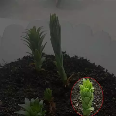 ⑵褛衣芽 褛衣芽一般在上一年的8、9、10月长出,因遇干旱,寒冷不长,冬天来临时叶变枯。由于低温,缺水,上部长得较慢,下部积累营养,因而养分充足,型状上小下大,根系多,一般在2、3月份种植时用。种植后是先发根,后抽叶。