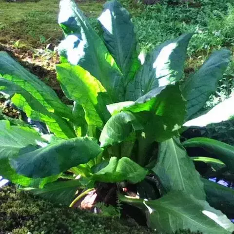 剑头芽(即慈姑芽或竹笋芽)假茎高约50厘米,基部粗壮,肉红色,上部细小,呈带灰绿的紫红色,黑斑大而显著,叶片狭长上举,叶背被有厚层的白粉。