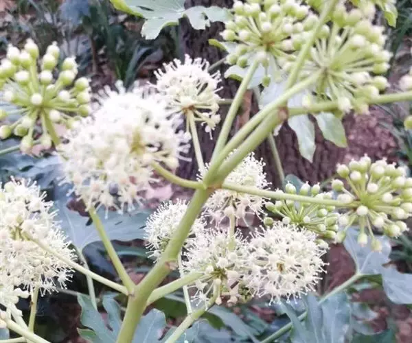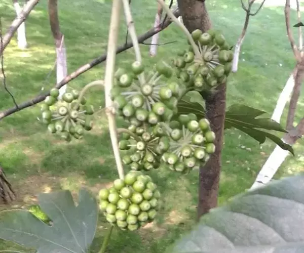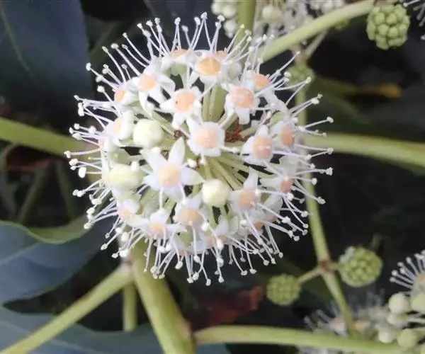 圆锥花序顶生,长20-40cm;伞形花序直径3-5cm,花序轴被褐色绒毛;花萼近全缘,无毛;花瓣5,卵状三角形,长2.5-3mm,黄白色,无毛;雄蕊5,花丝与花瓣等长;子房下位,5室,每室有1胚球;花柱5,分离;花盘凸起半圆形。果实近球形,直径5mm,熟时黑色。花期10-11月,果熟期翌年4月。