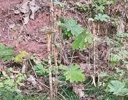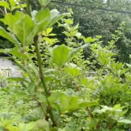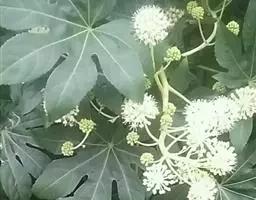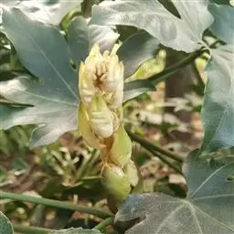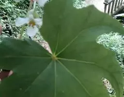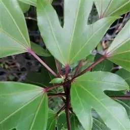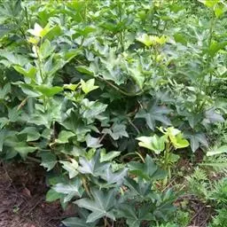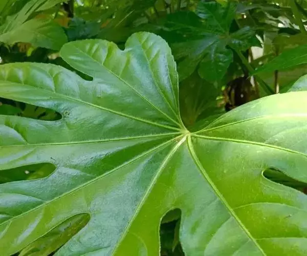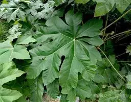 常绿灌木或小乔木,高可达5m。茎光滑无刺。叶柄长10-30cm;叶片大,革质,近圆形,直径12-30cm,掌状7-9深裂,裂片长椭圆状卵形,先端短渐尖,基部心形,边缘有疏离粗锯齿,上表面暗亮绿以,下面色较浅,有粒状突起,边缘有时呈金黄色;侧脉搏在两面隆起,网脉在下面稍显着。