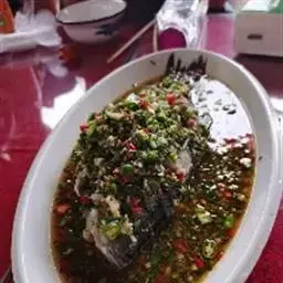 3、锅留底油,煸香姜蒜末,加蒜蓉辣酱、洋葱粒、青红椒粒、料酒、蚝油、高汤、盐、味精、胡椒粉调味,下入鲫鱼,烧制3分钟,取出码盘中,剩余汁水淋在小鲫鱼上即成。