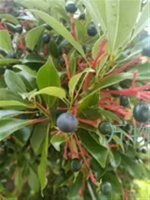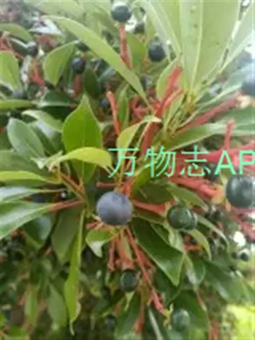 果扁球形,直径8-10毫米,初时绿色,后变黑紫色;果梗鲜红色。花期2月,果期7月。