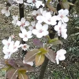 三、五色碧桃:又称撒金碧桃,大部分花为白色或微带红丝,间有一枝或数枝花为粉红色,也有一花或一花瓣白色与粉红色各半。长圆形花瓣,花枝红褐色。