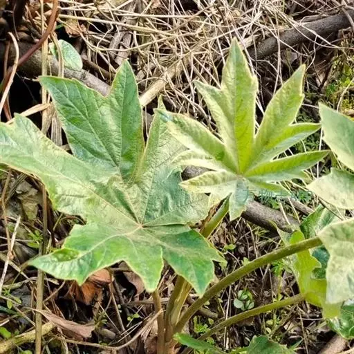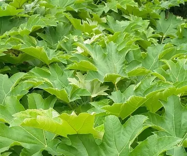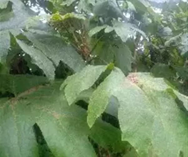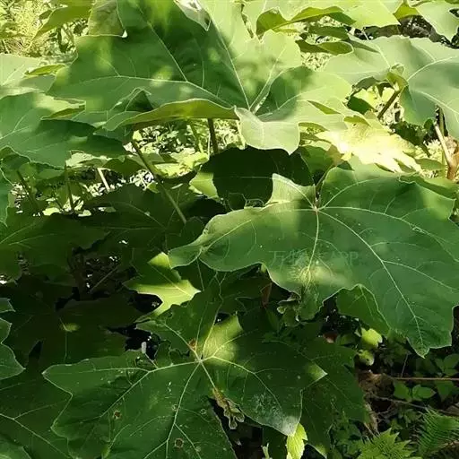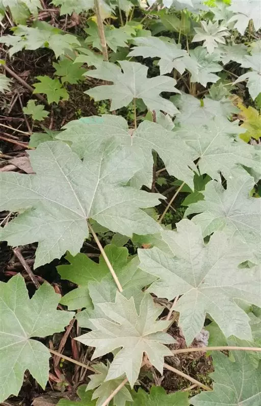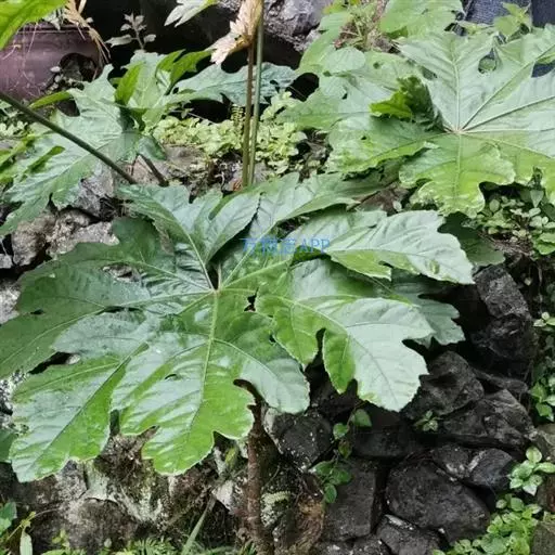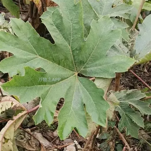版本二: 常 绿灌木或小乔木,高1-3.5米,基部直径6-9厘米;树皮深棕色,略有皱裂;新枝淡棕色或淡黄棕色,有明显的叶痕和大形皮孔,幼时密生黄色星状厚绒毛,后毛渐脱落。叶大,集生茎顶;叶片纸质或薄革质,长50-75厘米,宽50-70厘米,掌状5-11裂,裂片通常为叶片全长的1/3或1/2,稀至2/3,倒卵状长圆形或卵状长圆形,通常再分裂为2-3小裂片,先端渐尖,上面深绿色,无毛,下面密生白色厚绒毛,边缘全缘或疏生粗齿,侧脉和网脉不明显;叶柄粗壮,长30-50厘米,无毛;托叶和叶柄基部合生,锥形,长7.5厘米,密生淡棕色或白色厚绒毛。圆锥花序长50厘米或更长;分枝多,长15-25厘米;苞片披针形,长1-3.5厘米,密生白色或淡棕色星状绒毛;伞形花序直径1-1.5厘米,有花多数;总花梗长1-1.5厘米,花梗长3-5毫米,均密生白色星状绒毛;小苞片线形,长2-6毫米;花淡黄白色;萼长1毫米,边缘全缘或近全缘,密生白色星状绒毛;花瓣4,稀5,三角状卵形,长2毫米,外面密生星状厚绒毛;雄蕊和花瓣同数,花丝长约3毫米;子房2室;花柱2,离生,先端反曲。果实直径约4毫米,球形,紫黑色。花期10-12月,果期次年1-2月。