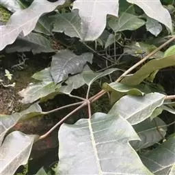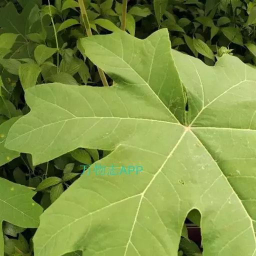 版本一:五加科常绿灌木或小乔木,高1-3.5m。茎粗壮,不分枝,幼稚时表面密被黄色星状毛或稍具脱落的灰黄色柔毛。茎贿大,白色,纸质;树皮深棕色,略有皱裂;新枝淡棕色或淡黄棕色,有明显的叶痕和大型皮孔。叶大,互生,聚生于茎顶;叶柄粗壮,圆筒形,长30-50cm;托叶膜质,锥形,基部与叶柄合生,有星状厚绒毛;叶片纸质或薄革质,掌状5-11裂,裂片通常为叶片全长的1/3-1/2,稀至2/3,倒卵状长圆形卵状长圆形,每一裂片常又有2-3个小裂片,全缘或有粗齿,上面深绿色,无毛,下面密被白色星状绒毛。伞形花序聚生成顶生或近顶生大型复圆锥花序,长达50cm以上;萼密被星状绒毛,全缘或近全缘;花瓣4,稀5,三角状卵形,长2mm,外面密被星状厚绒毛;雄蕊5,与花瓣同数;子房下位,2室,花柱2,离生,先端反曲。果球形,直径约4mm,熟时紫黑色。花期10-12月,果期翌年1-2月。